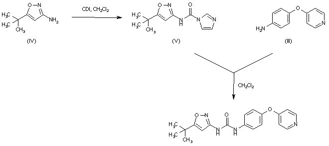 Treatment of 3-amino-5-tert-butylisoxazole (IV) with carbonyldiimidazole produced the imidazolide (V), which was then condensed with amine (III) to furnish the title urea.