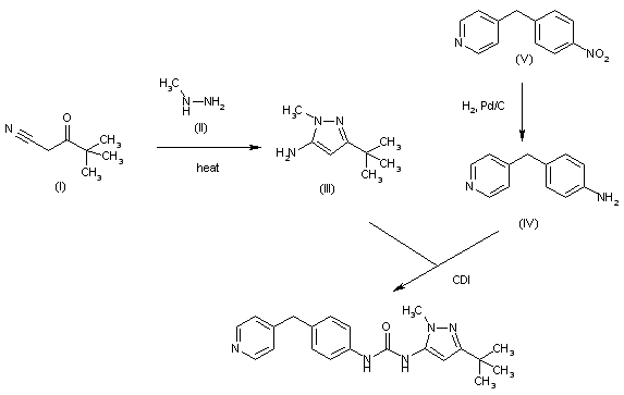 The cyclization of 2-pivaloylacetonitrile (I) with methylhydrazine (II) in refluxing ethanol gives 5-amino-3-tert-butyl-1-methylpyrazole (III), which is finally condensed with 4-(4-pyridylmethyl)aniline (IV) and carbonyldimidazole (CDI) in dichloromethane to afford the target urea. The aniline (IV) has been obtained by reduction of the corresponding nitro derivative (V) with H2 over Pd/C in ethanol.