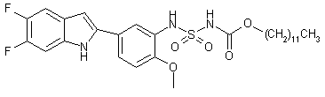Condensation of dodecanol (I) with chlorosulfonyl isocyanate in the presence of triethylamine afforded the chlorosulfonyl carbamate (II). Without isolation, sulfonyl chloride (II) was condensed with 5-(5,6-difluoro-1H-indol-2-yl)-2-methoxyaniline (III) to produce the title compound.
