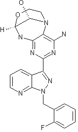 The cyclization of 1-(2-fluorobenzyl)pyrazolo[3,4-b]pyridine-3-carboxamidine (I) (see scheme no. 28591301a, intermediate (IX)) with phenylazomalononitrile (II) by means of NaOMe in hot DMF gives the pyrimidine (III), which is reduced with H2 over RaNi in hot DMF to yield the triaminopyrimidine (IV). The reductocondensation of (IV) with 2-(tert-butyldimethylsilyloxy)acetaldehyde (V) by means of NaBH3CN in methanol/AcOH affords the adduct (VI), which is desilylated by means of TBAF in THF to provide the 2-hydroxyethylamino derivative (VII). Finally, this compound is cyclized with aqueous glyoxal (VIII) to furnish the target tricyclic compound.