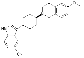 Condensation of 3-methoxyphenethylamine (I) with methyl chloroformate in the presence of Et3N gave carbamate (II). This was cyclized to the isoquinolinone (III) by treatment with polyphosphoric acid at 140 C. Reduction of lactam (III) with LiAlH4 provided the tetrahydroisoquinoline (IV). Reductive condensation of (IV) with 4-(5-cyano-3-indolyl)cyclohexanone (V) employing sodium triacetoxyborohydride furnished the corresponding 1,4-disubstituted cyclohexane as a cis/trans mixture from which the desired cis-isomer was isolated by column chromatography.