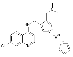 The (dimethylaminomethyl)ferrocene (I) was metalated with butyllithium and the organolithium intermediate (II) was condensed with dimethylformamide to furnish, after aqueous quenching, the ferrocenecarboxaldehyde (III). Aldehyde (III) was converted to oxime (IV) by treatment with hydroxylamine in aqueous ethanol. Reduction of oxime (IV) using LiAlH4 produced the primary amine (V). This was then condensed with 4,7-dichloroquinoline (VI) in hot NMP, and the resulting adduct was finally isolated as the L-tartrate salt.