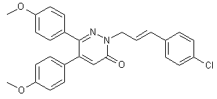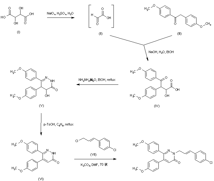 Glyoxylic acid (II), generated in situ by oxidative cleavage of tartaric acid (I) with sodium periodate, was condensed with deoxyanisoin (III) to provide the aldol adduct (IV). Cyclization of hydroxyacid (IV) with hydrazine gave rise to the hydroxy dihydropyridazinone (V), which was further dehydrated to (VI) upon treatment with p-toluenesulfonic acid in refluxing benzene. Finally, alkylation of pyridazinone (VI) with 4-chlorocinnamyl chloride (VII) in the presence of potassium carbonate furnished the title compound.