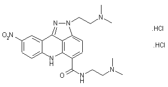 The Ullmann condensation between 2-chloro-5-nitrobenzoic acid (I) and 2-amino-4-chlorobenzoic acid (II) afforded the diaryl amine (III). Cyclization of (III) by treatment with POCl3 in refluxing xylene yielded a mixture of the desired acridine (IV) and minor amounts of its regioisomer (V). The isomeric mixture of acids (IV) and (V) was activated as the respective mixed anhydrides with ethyl chloroformate and subsequently condensed with N,N-dimethylethylenediamine (VI) to produce the corresponding amides. The required isomer (VII) was easily isolated from the mixture owing to its insolubility in the reaction solvent. Finally, the title pyrazoloacridine compound was prepared by condensation of (VII) with 2-(dimethylamino)ethyl hydrazine in 2-ethoxyethanol at 120 C.
