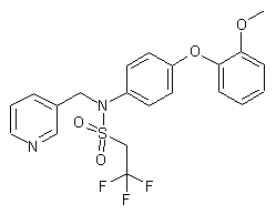 Coupling of 2-methoxyphenol (I) with 3-fluoronitrobenzene (II) produced the diaryl ether (III). The nitro group of (III) was then reduced by catalytic hydrogenation over Raney-Ni, yielding aniline (IV). Reductive alkylation of (IV) with pyridine-3-carboxaldehyde (V) using NaBH4 furnished the secondary amine (VI). This was finally acylated with 2,2,2-trifluoroethylsulfonyl chloride to produce the title sufonamide.