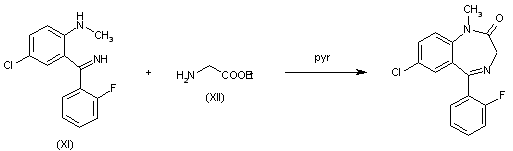 2) By cyclization of 2-methylamino-5-chloro-2?fluorodiphenylmethyleneimine (XI) with ethyl glycinate (XII) in refluxing pyridine.