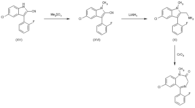 4) The methylation of 3-(2-fluorophenyl)-5-chloroindole-2-carbonitrile (XV) with dimethyl sulfate gives 3-(2-fluorophenyl)-5-chloro-1-methylindole-2-carbonitrile (XVI), which is reduced to yield 2-aminomethyl-3-(2-fluorophenyl)-5-chloroindole (X) (1), which is finally oxidized and cyclized again by treatment with CrO3 in acetic acid - water (X).