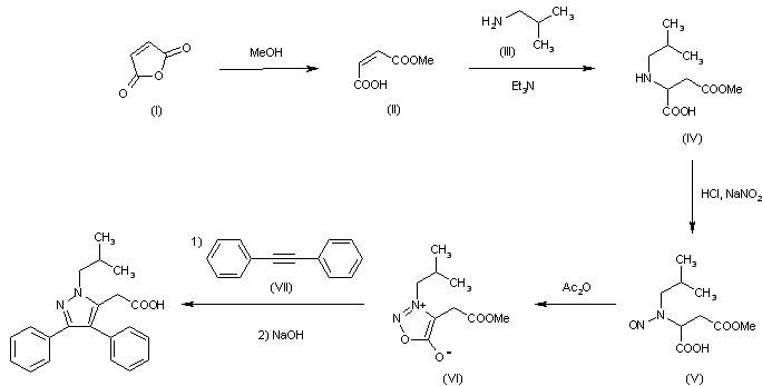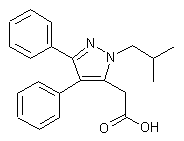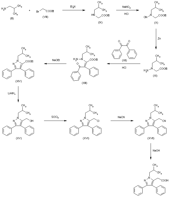 2) The reaction of isobutylamine (III) with ethyl bromoacetate (VIII) by means of triethylamine in benzene gives ethyl isobutylaminoacetate (IX), which by nitrosation with NaNO2 and HCl in water is converted into ethyl N-nitroso-N-isobutylaminoacetate (X). The reduction of (X) with Zn in ethanol - water affords ethyl N1-isobutylhydrazinoacetate (XI), which is condensed with benzyl (XII) by means of HCl - sodium acetate in refluxing ethanol - water to afford ethyl alpha-benzoylbenzyliden-N1-isobutylhydrazinoacetate (XIII). The cyclization of (XIII) by means of sodium ethoxide in refluxing ethanol gives rise to ethyl 1-isobutyl-3,4-diphenylpyrazole-5-carboxylate (XIV), which is reduced with LiAlH4 in ether to yield ethyl 1-isobutyl-3,4-diphenyl-5-(hydroxymethyl)pyrazole (XV). The reaction of (XV) with SOCl2 in refluxing chloroform gives 1-isobutyl-3,4-diphenyl-5-(chloromethyl)pyrazole (XVI), which by reaction with NaCN in hot DMSO is converted into 1-isobutyl-3,4-diphenylpyrazole-5-acetonitrile (XVII). Finally this compound is hydrolyzed by means of NaOH in refluxing aqueous ethanol.