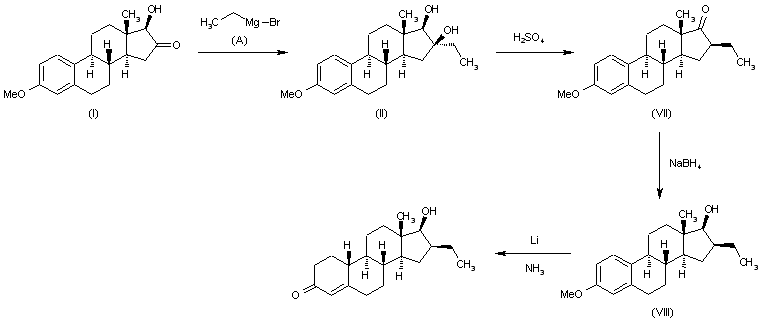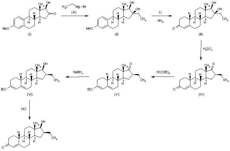 This compound can be prepared in several different ways: 1) The Grignard reaction of 3-methoxy-17beta-hydroxyestra-1,3,5(10)-trien-16-one (I) with ethyl magnesium bromide (A) in ether gives 3-methoxy-16alpha-ethylestra-1,3,5(10)-trien-16beta,17beta-diol (II), which by a Birch reduction with Li in liquid NH3 is converted into 16alpha-ethyl-16beta,17beta-dihydroxyestr4-en-3-one (III). The dehydration of (III) with H2SO4 in methanol yields 16-ethylestr-4-en-3,17-dione (VI), which by reaction with triethyl orthoformate in dioxane catalyzed by p-toluenesulfonic acid is converted into 3-ethoxy-16beta-ethylestra-3,5-diene-17-one (V). The reduction of (V) with NaBH4 in methanol affords 3-ethoxy-16beta-ethylestra-3,5-diene-17-ol (VI), which is finally hydrolyzed with HCl in methanol.