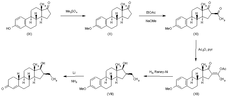 The methylation of estrone (IX) with methyl sulfate gives estrone 3-methyl ether (X), which is acetylated with ethyl acetate and sodium methoxide in DMSO yielding 16-acetylestrone-3-methyl ether (XI). The reaction of (XI) with acetic anhydride in pyridine at 65 C gives 16-(1'-acetoxyethylidene)estrone-3-methyl ether (XII), which is finally reduced with H2 over Raney-Ni in ethanol affording 16beta-ethyl-3-methoxyestra-1,3,5(10)-trien-17beta-ol (VIII). Finally this compound is submitted to a Birch reduction with Li in liquid NH3.