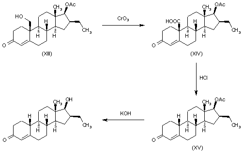 The oxidation of 19-hydroxy-16beta-ethyl-17beta-acetoxyandrost-4-en-3-one (XIII) with CrO3 and H2SO4 gives the corresponding carboxylic acid (XIV), which is decarboxylated with HCl in refluxing methanol affording 16beta-ethyl-17beta-acetoxyestra-4-en-3-one (XV). Finally this compound is hydrolyzed with KOH in refluxing methano.l