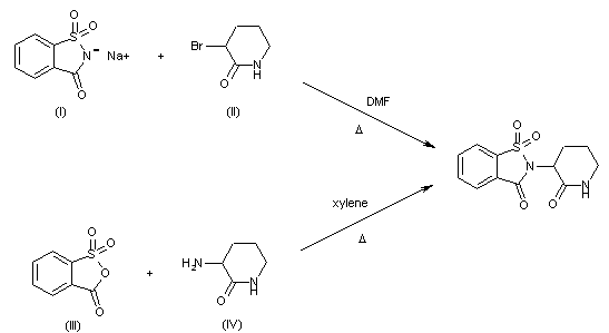This compound can be prepared in two different ways: 1) By condensation of the sodium salt of o-sulfobenzoylimide (I) with 3-bromo-2-piperidone (II) in refluxing DMF (1). 2) By condensation of o-sulfobenzoic acid anhydride (III) with 3-amino-2-piperidone (IV) in refluxing xylene (2).