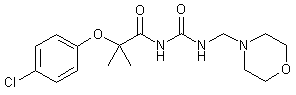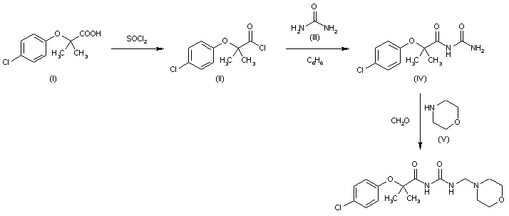 The reaction of 2-(p-chlorophenoxy)isobutyric acid (I) with SOCl2 gives the corresponding acyl chloride (II) which is condensed with urea (III) in refluxing benzene yielding 2-(p-chlorophenoxy)isobutyrylurea (IV). The aminomethylation of (IV) with formaldehyde and morpholine (V) affords N-2-(p-chlorophenoxy)isobutyryl-N'-morpholinomethylurea which can be further purified through hydrochloride salt.