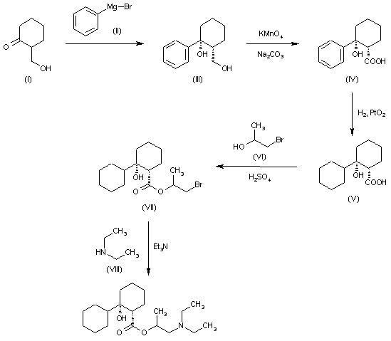 The Grignard reaction of 2-hydroxymethylcyclohexanone (I) with phenyl magnesium bromide (II) in ether gives 2-hydroxymethyl-1-phenylcyclohexanol (III), which by oxidation with KMnO4 in water containing Na2CO3 is converted into 2-phenyl-2-hydroxycyclohexanecarboxylic acid (IV). The reduction of (IV) with H2 over PtO2 in acetic acid at 80 C and 22 Kg/cm2 affords 2-cyclohexyl-2-hydroxycyclohexanecarboxylic acid (V) (1,2), which is esterified with 1-bromo-2-propanol (VI) by means of 85% H2SO4 yielding 1-bromoisopropyl-2-cyclohexyl-2-hydroxycyclohexanecarboxylate (VII). Finally this compound is treated with diethylamine (VIII) and triethylamine at 120 C (2).