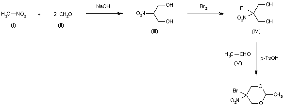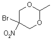 The condensation of nitromethane (I) with formaldehyde (II) by means of NaOH in water gives 2-nitropropane-1,3-diol (III), which is brominated with Br2 in ethyl acetate yielding 2-bromo-2-nitropropane-1,3-diol (IV) (1). Finally this compound is condensed with acetaldehyde (V) by means of p-toluenesulfonic acid in refluxing benzene (1-3).