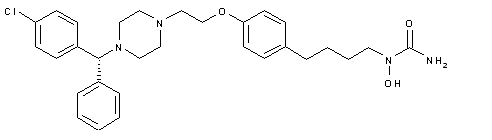 Esterification of 5-iodosalicylic acid (I) with methanol and H2SO4 provides the methyl ester (II). Subsequent palladium-catalyzed coupling of (II) with 3-butyn-1-ol (III) yields adduct (IV). Alkylation of the phenolic hydroxyl group of (IV) with 1,2-dibromoethane affords the bromoethyl ether (V). The bromide group of (V) is then displaced with (R)-p-chlorobenzhydryl piperazine (VI) to produce the disubstituted piperazine (VII). Mitsunobu coupling of alcohol (VII) with phenoxycarbonylamino phenoxyformate (VIII) furnishes the protected N-hydroxy carbamate (IX). Finally, ammonolysis of the ester groups of (IX) gives rise to a mixture of the title N-hydroxyurea derivative, along with the analogous methyl ester (X), which can be separated by means of flash chromatography