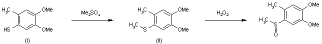 The methylation of 4,5-dimethoxy-2-methylthiophenol (I) with dimethyl sulfate by means of sodium ethoxide in refluxing ethanol gives 4,5-dimethoxy-2-methylphenyl methyl sulfide (II), which is then oxidized with H2O2 in glacial acetic acid.