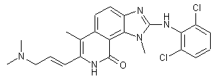 Nucleophilic substitution of 2,6-dichloro-3-nitrobenzonitrile (I) with methylamine provided the 2-(methylamino) regioisomer (II). The remaining chloride was subsequently displaced with the potassium enolate of ethyl 2-methylacetoacetate (III), yielding adduct (IV). After catalytic hydrogenation of the nitro group of (IV), the resulting amine (V) was condensed with 2,6-dichlorophenyl isothiocyanate (VI) to produce thiourea (VII), which was further cyclized to the benzimidazole (VIII) upon desulfuration with mercuric oxide. Decarbethoxylation and simultaneous cyclization between keto and cyano groups of (VIII) under acidic conditions gave rise to the fused pyridone system (IX). Regioselective oxidation of one methyl group of (IX) using selenium dioxide in hot dioxan furnished aldehyde (X). To this was added the vinyl Grignard reagent (XI), producing the allyl alcohol (XII), which was further esterified to acetate (XIII) with acetic anhydride and triethylamine. Finally, palladium-catalyzed displacement of the acetate group of (XIII) with dimethylamine, with concomitant double bond rearrangement, produced the title allylic amine.