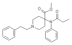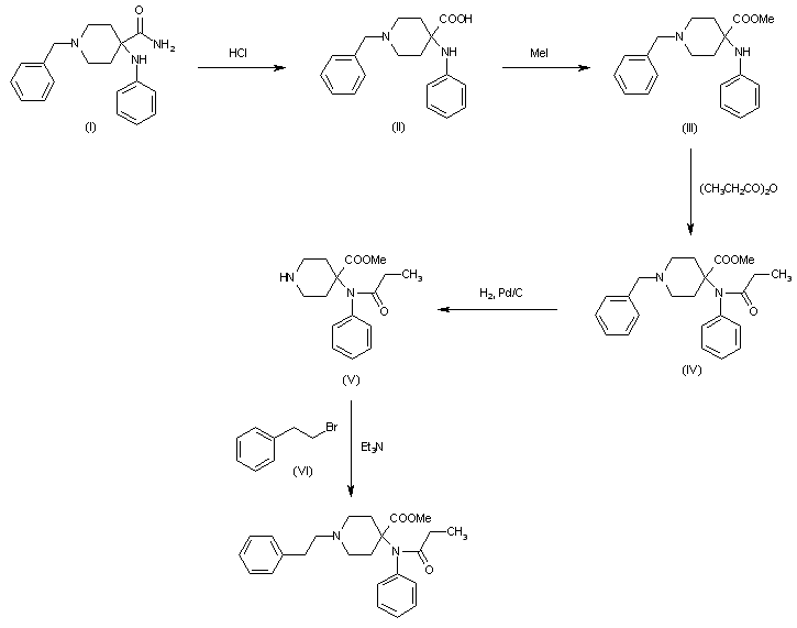 It can be prepared in two different ways: 1) The hydrolysis of 4-N-anilino-1-benzyl-4-carbamoylpiperidine (I) with refluxing concentrated HCl gives the corresponding acid (II), which is converted into its methyl ester (III) by reaction with NaOH and methyl iodide in HMPT (1). The acylation of (III) with propionic anhydride at reflux temperature affords methyl 4-(N-propionyl-N-phenylamino)-1-benzyl-4-piperidinecarboxylate (IV), which is debenzylated by hydrogenation with H2 over Pd/C in acetic acid yielding the free piperidine (V). Finally this compound is alkylated with (2-bromoethyl)benzene (VI) in hot DMA (2).
