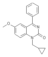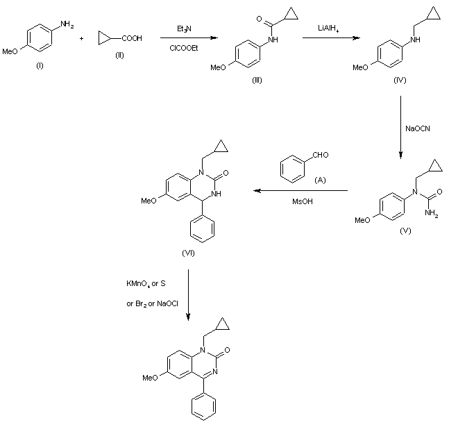 It can be prepared in several different ways: 1) The acylation of p-anisidine (I) with cyclopropanecarboxylic acid (II) by means of ethyl chloroformate and triethylamine gives N-cyclopropanecarbonyl-p-anisidine (III), which is reduced with LiAlH4 in THF yielding N-cyclopropylmethyl-p-anisidine (IV). The reaction of (IV) with sodium cyanate in acetic acid affords N-cyclopropylmethyl-N-(p-anisyl)urea (V), which is cyclized with benzaldehyde (A) by means of methanesulfonic acid in refluxing toluene giving 1-cyclopropylmethyl-4-phenyl-6-methoxy-3,4-dihydro-2(1H)-quinazolinone (VI) (1). Finally this product is dehydrogenated by oxidation with KMnO4 in dioxane - water (1), by treatment with Cl2 or Br2 with or without a base (2), or by treatment with sulfur in refluxing o-dichlorobenzene (3).