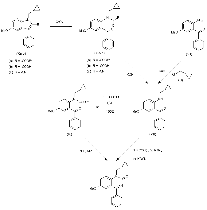 2) The alkylation of 2-amino-5-methoxybenzophenone (VII) with cyclopropylmethyl chloride (B) by means of NaH in THF gives 2-cyclopropylmethylamino-5-methoxybenzophenone (VIII), which by reaction with ethylchloroformate (C) at 100 C yields 2-(N-cyclopropylmethylethoxycarbonylamino)-5-methoxybenzophenone (IX). Finally this compound is cyclized with ammonium acetate and KOH in DMSO at 130 C (4). 3) The oxidation of 1-cyclopropylmethyl-3-phenyl-5-methoxyindole-2-carboxylic acid (2-carboxylic acid ethyl ester, or 2-carbonitrile) (Xa-c) with CrO3 in acetic acid - water gives 2-(N-cyclopropylmethyloxalylamino)-5-methoxybenzophenone (or ethoxalylamino or cyanocarbonylamino) (XIa-c), which can be hydrolyzed to the free amine (VIII) with KOH in DMSO - water (5). 4) The amine (VIII) can also be cyclized with potassium cyanate in hot acetic acid (5,6). 5) The amine (VIII) can also by cyclized by reaction with oxalyl chloride, followed by a treatment with sodium azide in acetone - water (7).