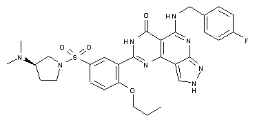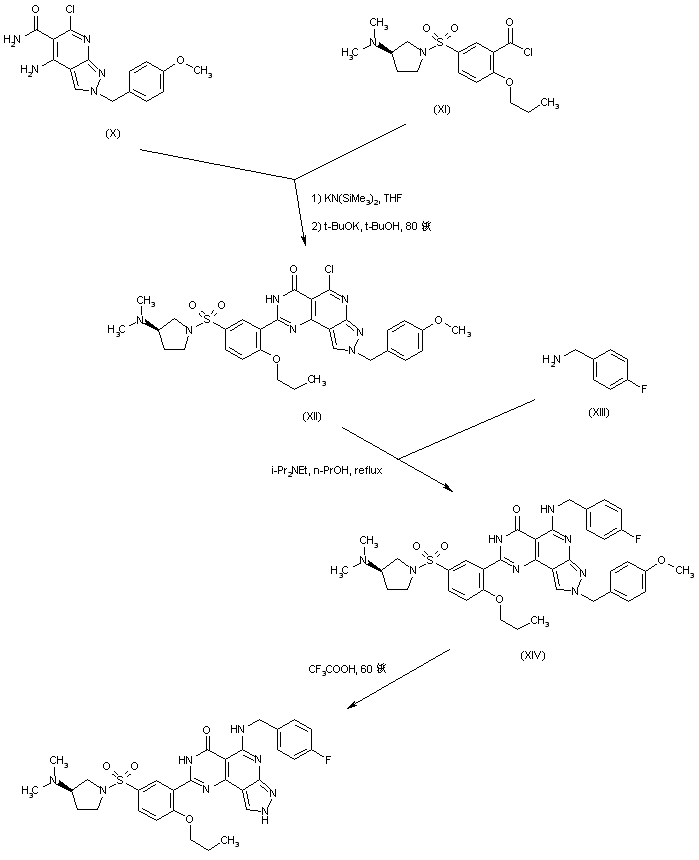 The pyrazolopyridopyrimidine tricyclic system (XII) was generated by acylation of amine (X) with acid chloride (XI), followed by base-mediated cyclization. Displacement of the remaining chloride of (XII) with p-fluorobenzyl amine (XIII) afforded (XIV). The p-methoxybenzyl group of (XIV) was finally removed by treatment with trifluoroacetic acid yielding the title compound.