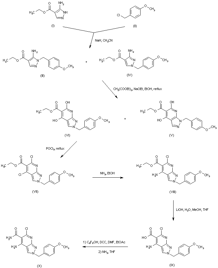 3-Amino-4-carbethoxypyrazole (I) was protected with p-methoxybenzyl chloride (II) in the presence of NaH to give two alkylated regioisomers (III) and (IV). This mixture was subjected to condensation with diethyl malonate under basic conditions to furnish the respective pyrazolopyridines (V) and (VI). Only isomer (VI) could be converted to its corresponding dichloro derivative (VII) under reflux in POCl3. Regioselective displacement of one chloride group from (VII) with ethanolic ammonia afforded amine (VIII). The ester group of (VIII) was then hydrolyzed by LiOH to the carboxylic acid (IX), which was converted to amide (X) via activation as the pentafluorophenyl ester.