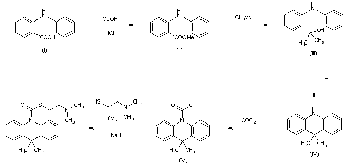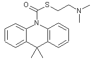The esterification of N-phenylanthranilic acid (I) with methanol and HCl yields the corresponding methyl ester (II), which by a Grignard reaction with methylmagnesium iodide in THF is converted into 2-anilinophenyl dimethyl carbinol (III). The cyclization of (III) with polyphosphoric acid at 170 C affords 9,9-dimethylacridan (IV), which by carbonylation with phosgene in refluxing toluene yields 9,9-dimethylacridan-10-carbonyl chloride (V) (1). Finally this compound is esterified with 2-dimethylaminoethanethiol (VI) by means of NaH in ether