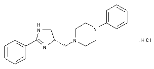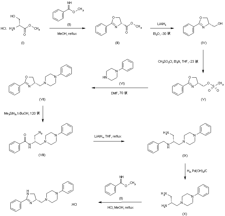 Cyclization of (R)-serine methyl ester (I) with methyl benzimidate (II) gave oxazolidine (III). Reduction of the methyl ester function of (III) with LiAlH4 at low temperature afforded the hydroxymethyl derivative (IV), which was further activated as the mesylate (V). Displacement of the mesylate group of (V) with phenylpiperazine (VI) resulted in the formation of the disubstituted piperazine (VII). Nucleophilic ring opening of oxazolidine (VII) by azidotrimethylsilane yielded azide (VIII). Both the amide and azide functions of (VIII) were subsequently reduced with LiAlH4 to produce (IX). Hydrogenolysis of the benzyl amine (IX) over Pearlman抯 catalyst furnished the chiral ethylenediamine (X). The title imidazoline was finally obtained by cyclization of diamine (X) with methyl benzimidate (II) as its hydrochloride form in refluxing MeOH.
