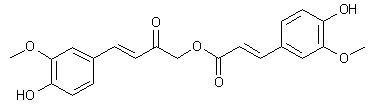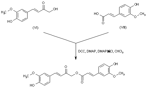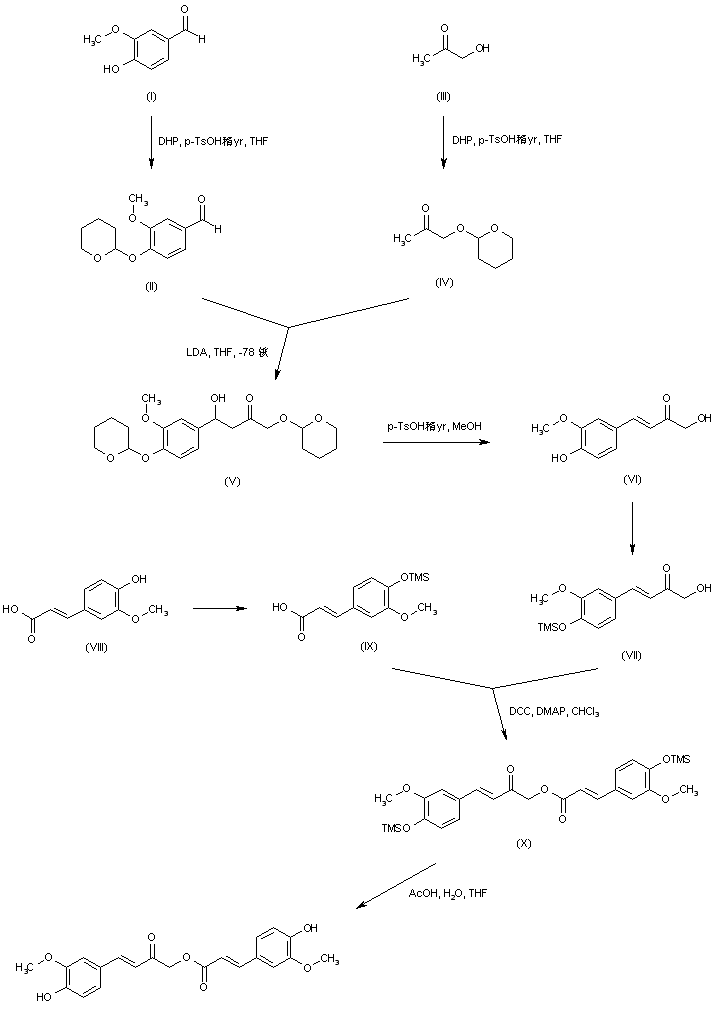 Vanillin (I) was protected as the tetrahydropyranyl ether (II) by treatment with dihydropyran in the presence of pyridinium p-toluenesulfonate. Similarly, hydroxyacetone (III) was converted to the corresponding tetrahydropyranyl ether (IV). Aldol condensation between aldehyde (II) and ketone (IV) using LDA in cold THF furnished the hydroxy ketone (V). Removal of the tetrahydropyranyl protecting groups of (V) under acidic conditions caused the dehydration of the beta-hydroxyl group, affording the unsaturated ketone (VI). The phenolic hydroxyl group of (VI) was then protected as the trimethylsilyl ether (VII). After protection of the phenolic hydroxyl group of ferulic acid (VIII) as the silyl ether (IX), coupling between (IX) and (VII) by means of DCC and DMAP provided the silyl-protected ester (X). This was finally desilylated by treatment with HOAc in aqueous THF.