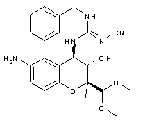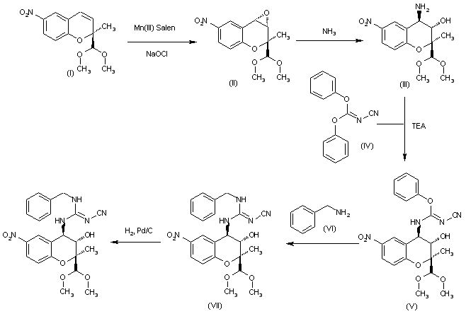 The asymmetric epoxidation of (R)-2-methyl-6-nitro-2H-1-benzopyran-2-carbaldehyde (I) with NaOCl catalyzed by the chiral catalyst Mn(III)-Salen gives the chiral epoxide (II), which is opened by means of NH3 in hot ethanol to yield the amino alcohol (III). The reaction of (III) with diphenylcyanocarbonimidate (IV) by means of TEA in DMF/isopropanol affords the N-cyano-O-phenylisourea (V), which by reaction with benzylamine (VI) in the same solvent provides the N-cyanoguanidine (VII). Finally, the nitro group of this compound is reduced with H2 over Pd/C or NaBH4 in methanol to give the target amino derivative.