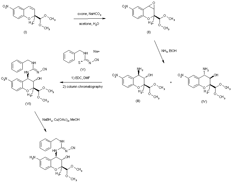 Epoxidation of the chiral benzopyran derivative (I) by means of oxone furnished the diastereomeric epoxides (II). Subsequent epoxide ring opening with ethanolic ammonia gave rise to the mixture of amino alcohols (III) and (IV). Condensation of this mixture with N-cyano-N'-benzylthiourea sodium salt (V) in the presence of EDC produced the corresponding mixture of guanidines from which the target (2S,3S,4R)-isomer (VI) was isolated by column chromatography. Finally, reduction of the nitro group of (VI) to the desired amine was accomplished by treatment with NaBH4 in the presence of cupric acetate.