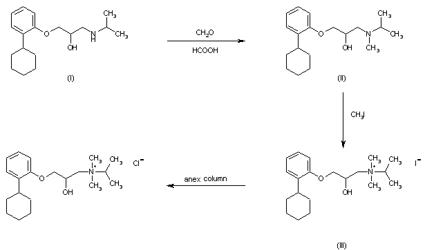 Reaction of 1-isopropylamino-3-(3-cyclohexylphenoxy)-2-propanol (I) (exaprolol) with formaldehyde and formic acid affords the N-methyl derivative (II), which is subsequently quaternized by methyliodide. The iodide (III) is then converted to the chloride on an anex column.