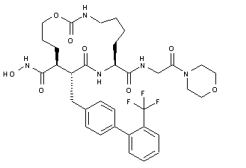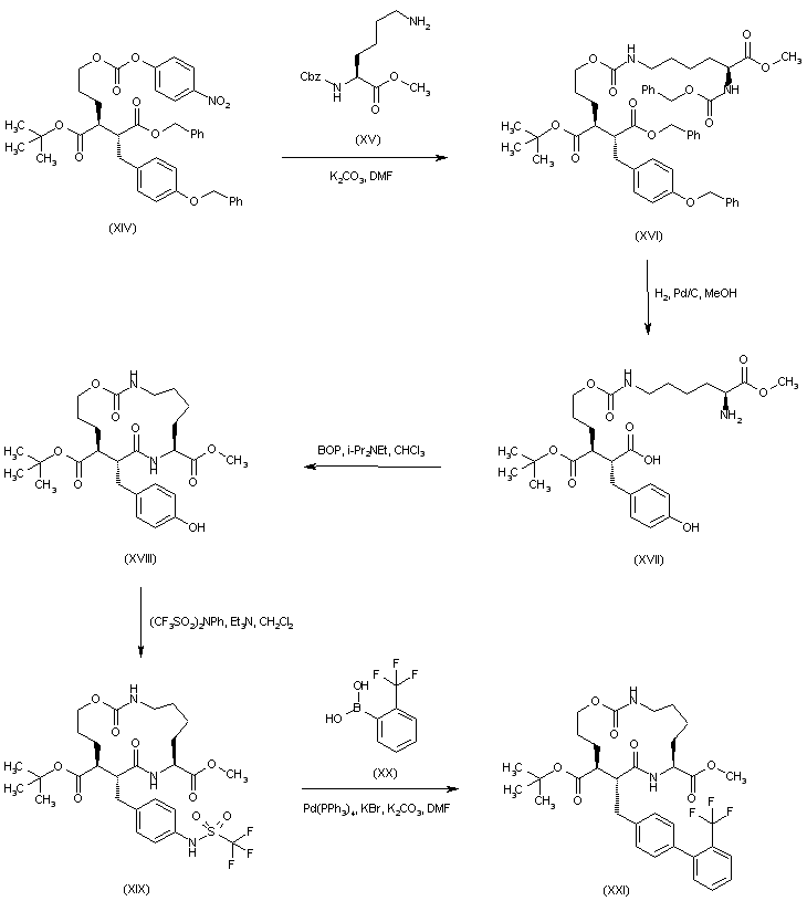 Condensation of carbonate (XIV) with N-alpha-Cbz-lysine methyl ester (XV) afforded the carbamate (XVI). The benzyl ester and N-Cbz protecting groups of (XVI) were then removed by catalytic hydrogenolysis, yielding amino acid (XVII), which was subjected to intramolecular cyclization in the presence of BOP to furnish the macrocyclic compound (XVIII). After conversion of the phenolic hydroxyl of (XVIII) to the aryl triflate (XIX), Suzuki coupling with 2-(trifluoromethyl)phenylboronic acid (XX) provided the biphenyl derivative (XXI).