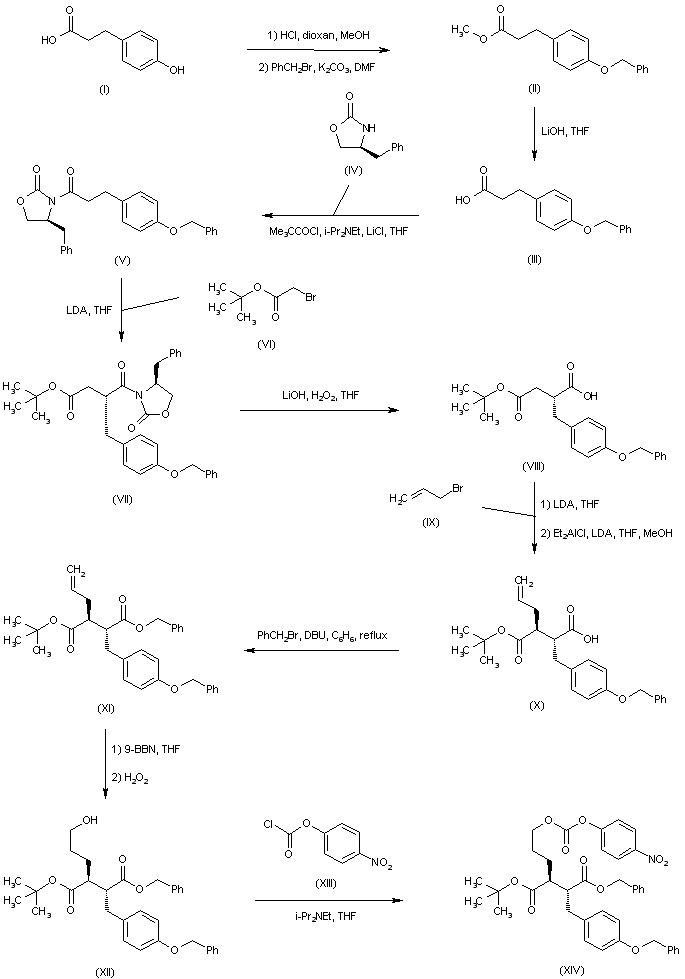 Esterification of 3-(4-hydroxyphenyl)propionic acid (I), followed by alkylation of the phenolic hydroxyl, provided methyl 3-(4-benzyloxyphenyl)propionate (II), which was hydrolyzed to the corresponding carboxylic acid (III) by means of LiOH. Coupling of carboxylic acid (III) with the chiral auxiliary (S)-4-benzyl-2-oxazolidinone (IV) gave the oxazolide (V), which was subjected to diastereoselective alkylation with tert-butyl bromoacetate (VI), yielding (VII). Subsequent removal of the chiral auxiliary group of (VII) using lithium hydroperoxide afforded the (R)-acid (VIII). Alkylation of the dianion of acid (VIII) with allyl bromide (IX) and further epimerization in the presence of LDA and Et2AlCl furnished the anti-dialkylated succinate (X). The carboxyl group of (X) was then alkylated using benzyl bromide and DBU to produce the corresponding benzyl ester (XI). Olefin (XI) hydroboration followed by oxidative work-up gave rise to the primary alcohol (XII). This was acylated with 4-nitrophenyl chloroformate (XIII) to provide the activated carbonate (XIV).