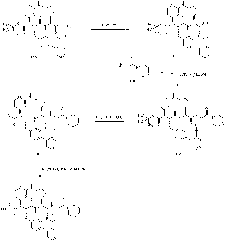 Saponification of the methyl ester (XXI) using LiOH gave the carboxylic acid (XXII). This was coupled with the glycine amide (XXIII) to produce adduct (XXIV). The desired hydroxamic acid was then obtained by trifluoroacetic acid-promoted cleavage of the tert-butyl ester of (XXIV), followed by coupling of the resulting carboxylic acid (XXV) with hydroxylamine.