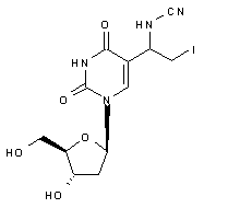 The title 1-cyanamido-2 iodoethyl derivative was synthesized by reaction of 5-vinyl-2'-deoxyuridine (I) with N-iodosuccinimide in the presence of cyanamide in cold dimethoxyethane.