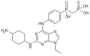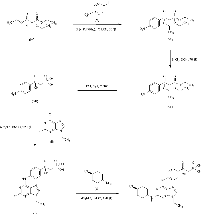 Reaction of phosphinylmethyl phosphonate (IV) with 1-iodo-4-nitrobenzene (V) in the presence of Pd(PPh3)4 affords the nitrophenyl phosphinoyl derivative (VI). Reduction of the nitro group of (VI) to the corresponding aniline (VII) is accomplished by treatment with SnCl2 in ethanol. Then, hydrolysis of the triethyl ester (VII) under acidic conditions furnishes phosphonic acid (VIII). Displacement of the 6-chloro group of purine (III) with the aminophenyl phosphonic acid (VIII) in hot DMSO gives rise to the 6-anilino purine (IX). Finally, displacement of the remaining halogen atom of (IX) with trans-1,4-diaminocyclohexane (X) leads to the title 2,6-diaminopurine compound.