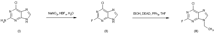 2-Amino-6-chloropurine (I) is converted into the 2-fluoro analogue (II) by diazotization in the presence of fluoroboric acid. Subsequent alkylation of (II) with EtOH under Mitsunobu conditions provides the 9-ethyl purine (III).