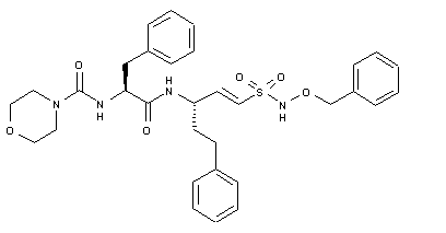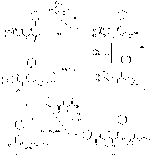 The Horner-Wadsworth-Emmons olefination of N-(tert-butoxycarbonyl)-L-homophenylalaninal (I) with phosphonate (II) by means of NaH in THF gives the vinylsulfonate (III), which is treated with tetrabutylammonium iodide and triphosgene to yield the sulfonyl chloride (IV). The reaction of (IV) with O-benzylhydroxylamine in dichloromethane affords the N-sulfonylhydroxylamine derivative (V), which is deprotected with TFA in dichloromethane, providing compound (VI) with a free amino group. Finally, this compound is condensed with N-(morpholin-4-ylcarbonyl)-L-phenylalanine (VII) by means of HOBt, EDC and NMM in DMF, giving rise to the target amide.