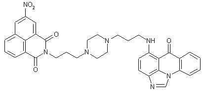 2,6-Dichloro-3-nitrobenzoic acid (I) was condensed with aniline (II) to produce the anilinobenzoic acid (III), which was subsequently cyclized to the acridinone (IV) upon treatment with POCl3. Displacement of the chloride group of (IV) with 1,4-bis(3-aminopropyl)piperazine (V) in DMF afforded adduct (VI). The nitro group of (VI) was reduced by catalytic hydrogenation in the presence of Raney-Ni and formic acid, and the intermediate formamide was further cyclized under acidic conditions to the imidazoacridinone (VII). Finally, conversion of the primary amino group of (VII) to the target imide was achieved by heating with 3-nitro-1,8-naphthalenedicarboxylic anhydride (VIII) in DMF.