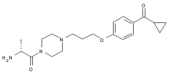 Cyclization of 4-chloro-4'-hydroxybutyrophenone (I) in the presence of 50% aqueous NaOH produces cyclopropyl (4-hydroxyphenyl) ketone (II). This is then alkylated with 1-bromo-3-chloropropane (III) to afford the chloropropyl ether (IV). Chloride displacement in (IV) with an excess of piperazine (V) in the presence of KI and K2CO3 furnishes the monosubstituted piperazine (VI). Subsequent coupling of piperazine (VI) with N-Boc-L-alanine (VII) leads to amide (VIII). Finally, Boc group cleavage in (VIII) employing trifluoroacetic acid yields the title compound (1-3).