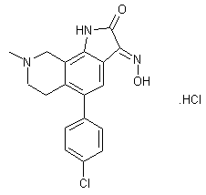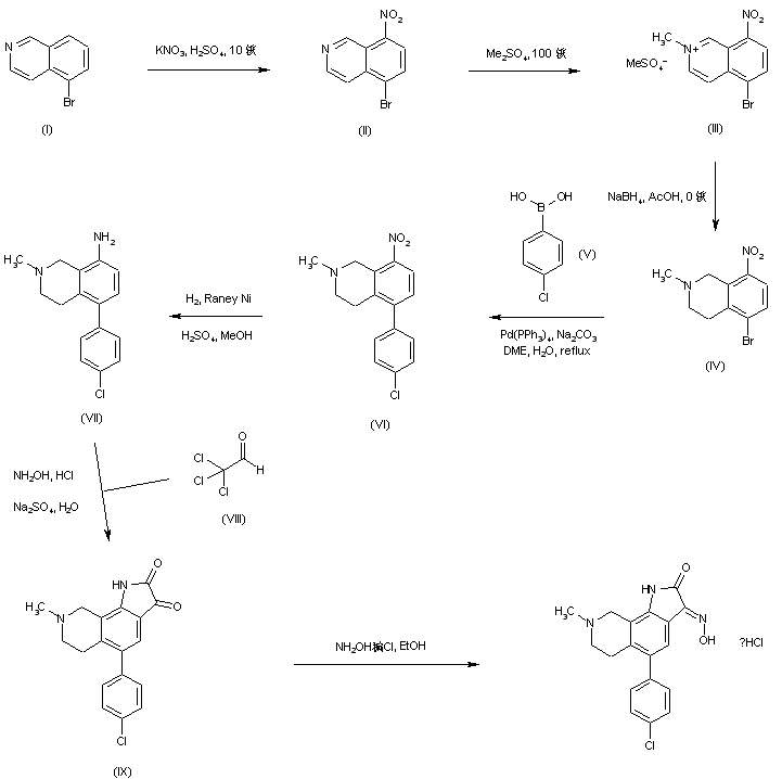 Nitration of 5-bromoisoquinoline (I) employing KNO3 in H2SO4 provides 5-bromo-8-nitroisoquinoline (II). Quaternization of isoquinoline (II) with dimethyl sulfate, followed by reduction of the resultant N-methyl isoquinolinium salt (III) with NaBH4 in cold HOAc furnishes the tetrahydroisoquinoline (IV). Subsequent Suzuki coupling between the bromotetrahydroisoquinoline (IV) and 4-chlorophenylboronic acid (V) yields the 5-aryl isoquinoline derivative (VI). The nitro group of (VI) is further reduced to amine (VII) by catalytic hydrogenation over Raney nickel. The key isatin compound (IX) is then obtained by condensation of amine (VII) with chloral (VIII) in the presence of hydroxylamine hydrochloride and sodium sulfate. Finally, isatin (IX) is converted to the desired oxime by treatment with hydroxylamine hydrochloride in EtOH.