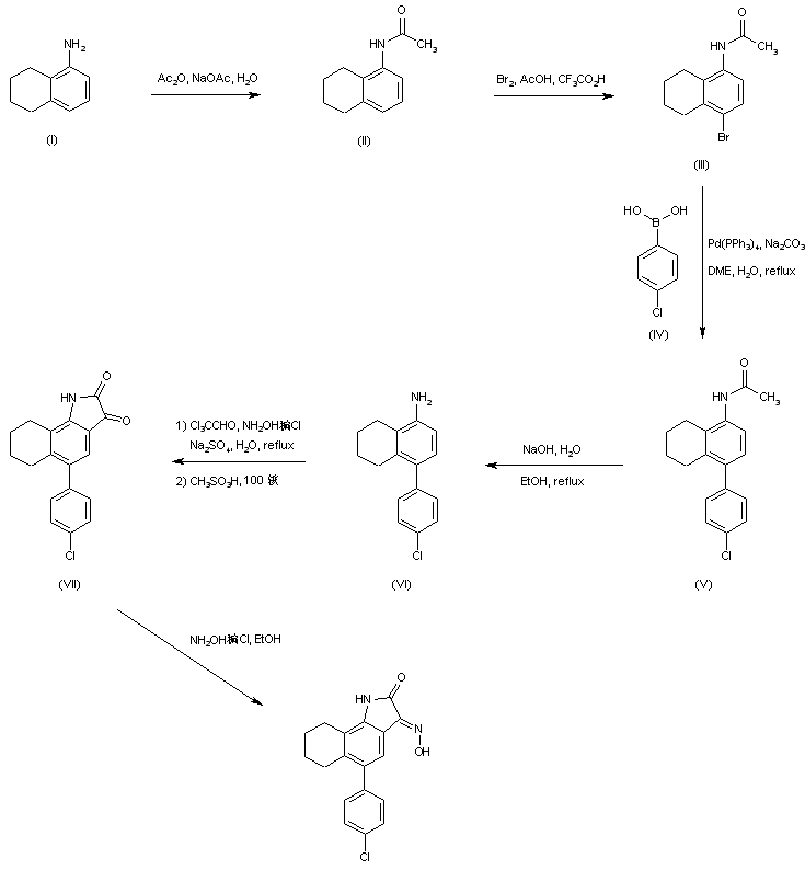 1-Amino-5,6,7,8-tetrahydronaphthalene (I) is protected as the corresponding acetamide (II) by treatment with Ac2O in the presence of NaOAc. Bromination of (II) with bromine in trifluoroacetic acid leads to (III). Then, Suzuki coupling between aryl bromide (III) and 4-chlorophenylboronic acid (IV) furnishes the aryl tetrahydronaphthalene (V). Acetamide hydrolysis in (V) under alkaline conditions provides amine (VI). Condensation of (VI) with chloral and hydroxylamine, followed by cyclization in hot methanesulfonic acid generates the isatin derivative (VII). This is finally converted to the title oxime upon treatment with hydroxylamine hydrochloride in ethanol.