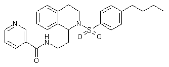 Acylation of phenethylamine (III) with acid chloride (II), prepared from phthalimidopropionic acid (I) and SOCl2, gave amide (IV). Subsequent Bischler-Napieralski cyclization of amide (IV) in the presence of POCl3 and P2O5 produced the corresponding dihydroisoquinoline, which was isolated as the hydrochloride salt (V). Catalytic hydrogenation of (V) using PtO2 afforded the tetrahydroisoquinoline (VI). After protection of (VI) as the N-Boc derivative (VII), the primary amine (VIII) was liberated by phthaloyl group hydrazinolysis. Coupling of amine (VIII) with nicotinic acid (IX) employing EDC and HOBt yielded the nicotinamide compound (X). Subsequent acidic cleavage of the Boc protecting group of (X) provided amine (XI), which was finally acylated with 4-butylbenzenesulfonyl chloride (XII) in the presence of resin-bound piperidine to furnish the target sulfonamide.