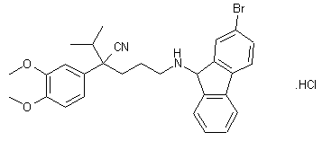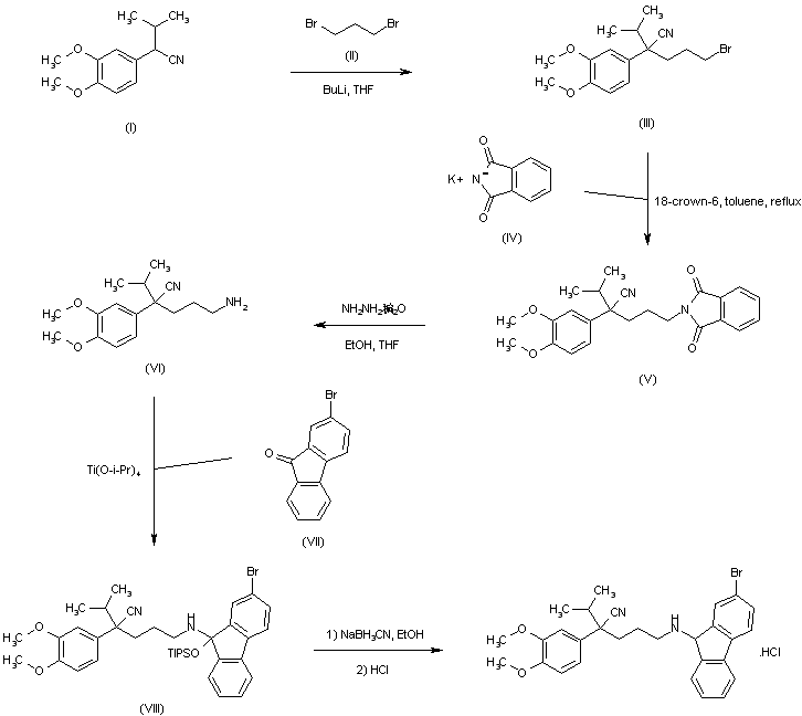 Alkylation of the lithium salt of 2-(3,4-dimethoxyphenyl)isobutyronitrile (I) with 1,3-dibromopropane (II) gave the bromo nitrile (III). Conversion of bromide (III) into the desired primary amine (VI) was achieved through a Gabriel synthesis by condensation with potassium phthalimide (IV), followed by hydrazinolysis of the resultant N-substituted phthalimide (V). A two-step procedure was finally employed for the reductive alkylation of amine (VI), consisting of condensation between amine (VI) and the bromo fluorenone (VII) in the presence of titanium isopropoxide and then reduction of the intermediate (VIII) with NaBH3CN.