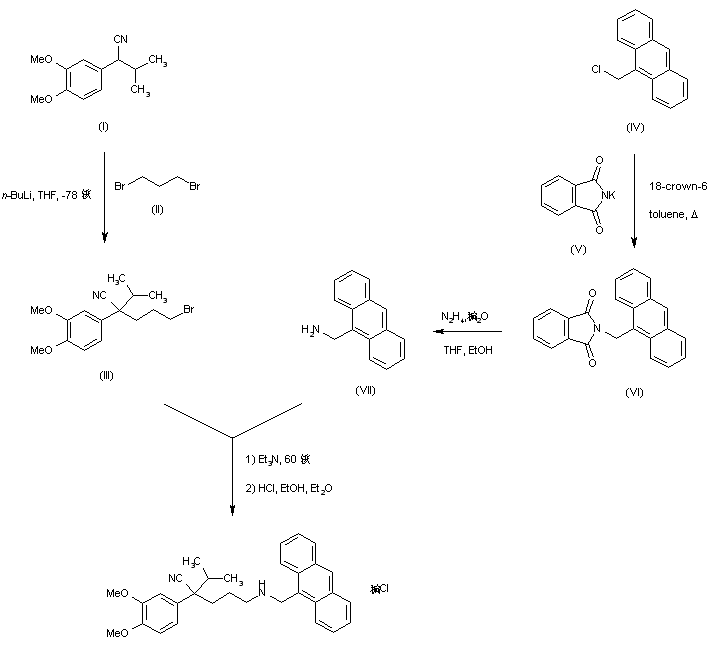 Reaction of 2-(3,4-dimethoxyphenyl)-3-methylbutyronitrile (I) with 1,3-dibromopropane (II) in the presence of n-butyllithium at -78 C provided bromonitrile (III). Alkylation of potassium phthalimide (V) with 9-(chloromethyl)anthracene (IV) yielded the N-alkylated phthalimide (VI), and subsequent hydrazinolysis gave the aminomethyl compound (VIII). Finally, amine (VIII) was alkylated with bromide (III) in Et3N at 60 C to produce the title compound, which was isolated as the corresponding hydrochloride salt.