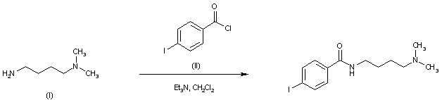 The title amide is obtained by acylation of N,N-dimethyl-1,4-butanediamine (I) with 4-iodobenzoyl chloride (II) in the presence of Et3N in CH2Cl2.