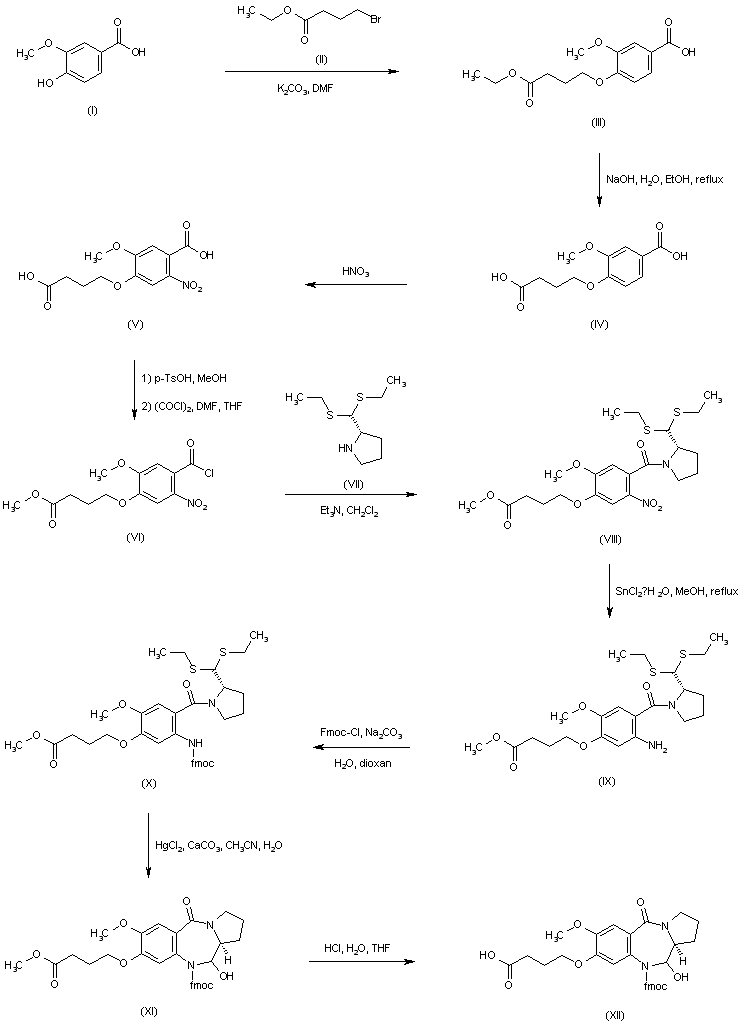 Vanillic acid (I) was alkylated with ethyl bromobutyrate (II) to afford ether (III). The ester function of (III) was then subjected to saponification, yielding diacid (IV). Nitration of (IV) gave the nitro compound (V). Selective esterification of the aliphatic carboxyl group of (V) was achieved employing p-toluenesulfonic acid in methanol, and the resultant mono-acid was further converted to the corresponding acid chloride (VI) upon treatment with oxalyl chloride. Coupling of acid chloride (VI) with (S)-pyrrolidine-2-carbaldehyde diethyl dithioketal (VII) provided amide (VIII). After the reduction of the nitro group of (VIII) by means of SnCl2, the resultant amino compound (IX) was protected as the N-Fmoc derivative (X). Thioketal deprotection of (X) with concomitant cyclization in the presence of HgCl2 and CaCO3 gave rise to the pyrrolobenzodiazepinone system (XI). The methyl ester of (XI) was then hydrolyzed under acidic conditions to furnish acid (XII).