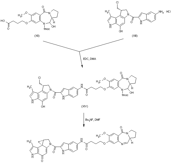 Acid (XII) was coupled with the indolyl amine (XIII) by means of EDC to give amide (XIV). Finally, simultaneous removal of the Fmoc protecting group of (XIV) and cyclization of its seco-cyclopropapyrroloindole moiety were accomplished in one step by treatment with tetrabutylammonium fluoride in DMF, producing the target compound.